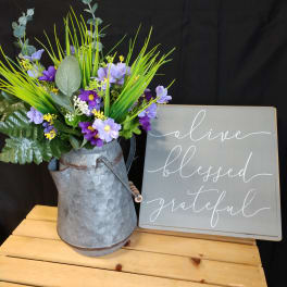 Price: $69.99Alive blessed grateful silk arrangement in a metal coffee pot