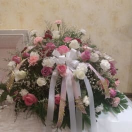 Price: $350.00White ,Pinks and purple half casket cover